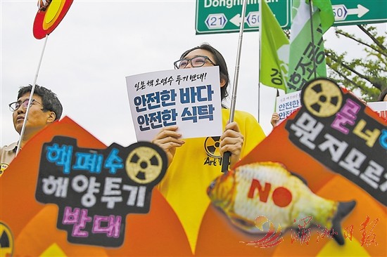 7月8日,民众在韩国首尔手举标语牌参加集会,反对日本核污染水排海。人们手持鲸鱼模样的蓝色气球,举着“反对排放放射性核污染水”等标语,对日本政府不顾邻国及国际社会担忧执意推动核污染水排海计划表示愤怒。