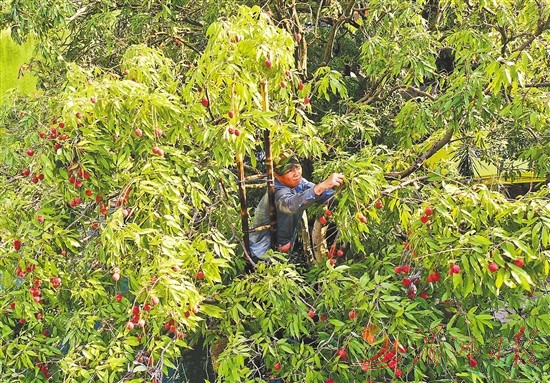 又是一年荔枝红。图为7月11日,延寿溪两岸,果农在树上采摘荔枝。