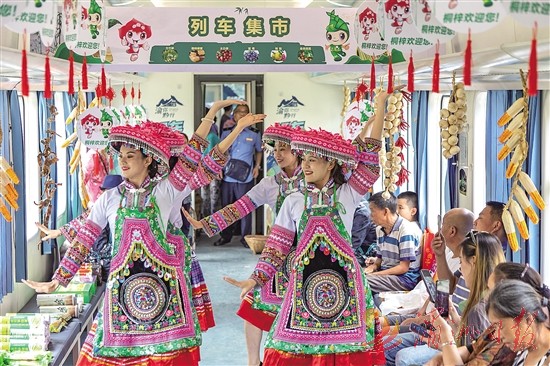 暑运以来,中国铁路成都局集团有限公司重庆客运段在贵州往返重庆的5630/5629次普速列车上打造主题文化车厢,增设“列车集市”和非遗大舞台,在助农增收的同时,满足旅客暑期多元化出行需求。旅客乘坐该趟列车,不仅可欣赏沿途各地的风景,还能在列车上逛“集市”、看非遗表演,体验别样旅途时光。 新华社 发