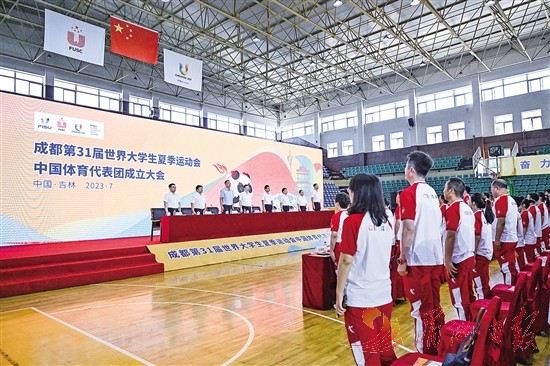 这是7月12日拍摄的成立大会现场。当日,成都第31届世界大学生夏季运动会中国大学生体育代表团成立大会在吉林省长春市召开。 新华社记者 颜麟蕴 摄