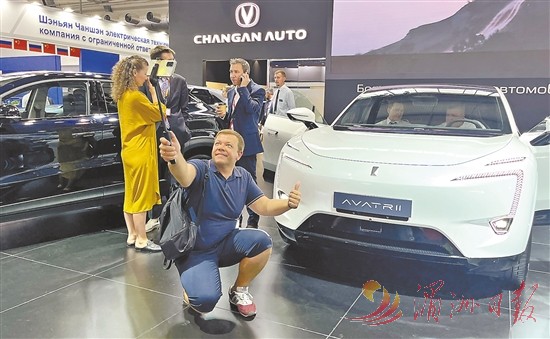 7月11日,在俄罗斯叶卡捷琳堡举办的第七届中俄博览会上,参观者与中方企业展出的汽车合影。第七届中俄博览会11日在俄罗斯斯维尔德洛夫斯克州首府叶卡捷琳堡市开幕。中俄博览会自2014年以来已经成功举办六届,是目前中俄两国间级别最高、规模最大的综合性展会,为促进两国地方和企业合作、助力双边经贸关系发展发挥着重要作用。新华社记者 赵冰 摄