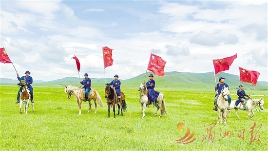 在科右前旗乌兰毛都杭盖草原深处,一支骑兵队吸引了采访团的目光,这是科右前旗民兵骑兵连、守望草原巡防队刚从边境线上巡逻归来。这群不穿军装却甘守边防、不是战士却一心守边的护边员队伍,被誉为“流动的哨兵”“有生命的界碑”。苏道牧场内,骑兵连队员吴苏道、白萨仁夫妇早就做好迎接来自全国各地媒体朋友的准备,多年来,这对自愿为祖国巡边护边的蒙古族夫妇一直保持着对远方来客最浓烈的热情。