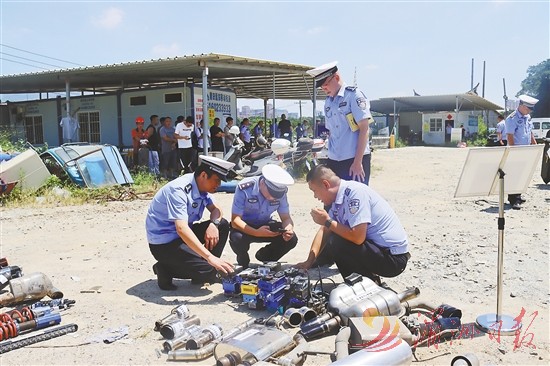 现场会当天,在华亭镇沈塘停车场“飙车炸街”违法车辆集中销毁现场,随着指挥员一声令下,拼改装车车主当场拆除非法改装配件,工作人员现场切割、销毁改装配件(如图),直至改装车辆全部整改完毕。
