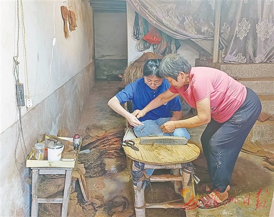 白沙镇广山村是蓑衣之乡。黄秀云是该村一名手工艺人,在她手中,一片片棕榈叶变成了棕编制品,别致精美的蓑衣、好看实用的生活用品让人目不暇接。眼下,她和村民吴芬华忙教返乡大学生制作蓑衣。返乡大学生们表示,要把文化传承当成一种生活态度,在学习中提升自己,为建设和美乡村贡献自己的力量。