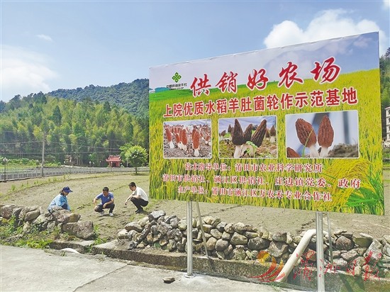 上院村位于望江山的半山麓上,平均海拔700米,属高山地带,气候温暖湿润,地理位置得天独厚,十分适宜绿色无公害农产品生长,特别是优质水稻及羊肚菌的生长。今年4月,庄边镇与涵江区供销合作社联合社、市农科所省级科技特派员团队,共同建设水稻菌粮轮作试验示范种植基地,首批试点流转土地1.54公顷,以“水稻+羊肚菌”的方式进行轮作,推动抛荒地复耕复种,盘活农村土地资源,保障粮食安全。庄边供销社主任林梅兰告诉记者,轮作制可以很好衔接茬口、消减连作障碍、培肥土壤等,尤其是冬季种植羊肚菌,能进一步增加农田的利用价值,提升土地效益,让“冬闲田”变身“增收田”,预计水稻和羊肚菌亩均产量都可达500公斤,年总产值达120万元,带动农户增收。