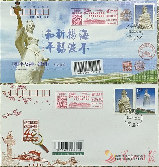 本报讯 (全媒体记者 郑已东 文/图)连日来,一枚枚加盖“福建莆田妈祖邮局66”邮资机戳的信封、明信片、邮简从莆田陆续发出(如图),寄往世界各地。
