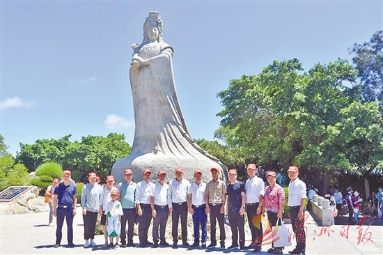 参访团在妈祖石雕像前合影留念。