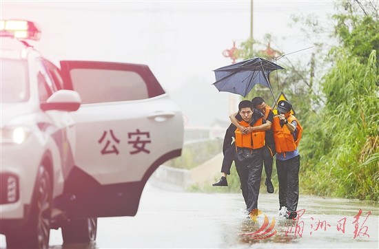 7月28日上午,涵江公安分局江口派出所民警紧急转移江口镇园顶村低洼地区的群众。