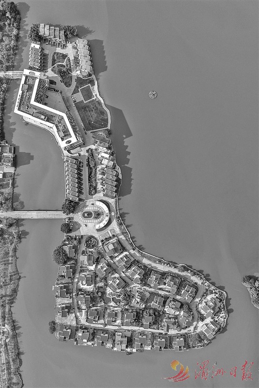 在空中鸟瞰白塘湖,湖中的建筑群像一只穿着运动鞋的脚,很是有趣。
