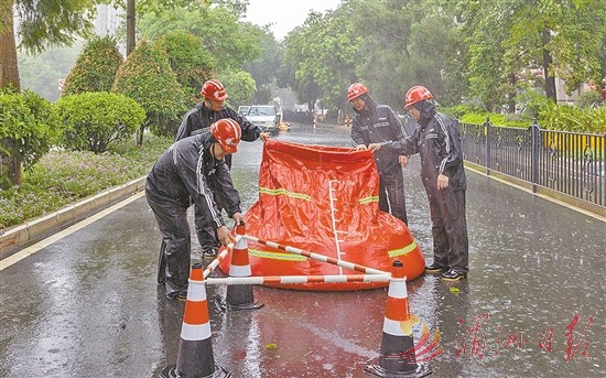 昨日,莆仙大剧院路段,市水务集团工作人员利用管涌罩罩住下水井盖,防止污水涌出、人员陷落。 全媒体记者 陈斌 摄