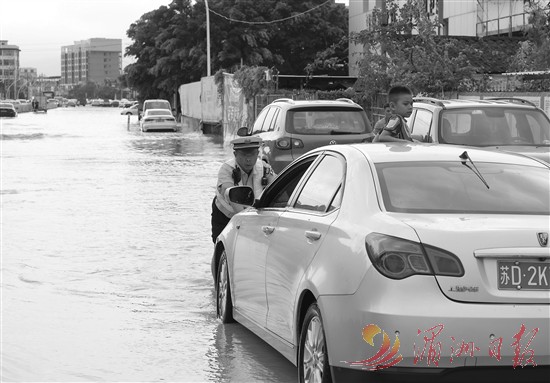 7月29日,在莆田市涵江区,交警将被困车辆推出涉水路段。 新华社记者 郭圻 摄