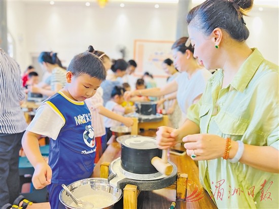 在劳动中收获,在体验中学习。白塘镇双福村党群服务中心开展“一粒豆的旅程”亲子科普实践活动。孩子们在科普老师和家长的帮助下,以小厨师的身份,从磨黄豆开始,通过泡、磨、滤、煮、点,体验将一颗颗小黄豆变为豆浆、豆皮、豆腐花、豆腐的过程(如图)。大家现场品尝了自己制作的豆浆和豆腐,快乐加倍。