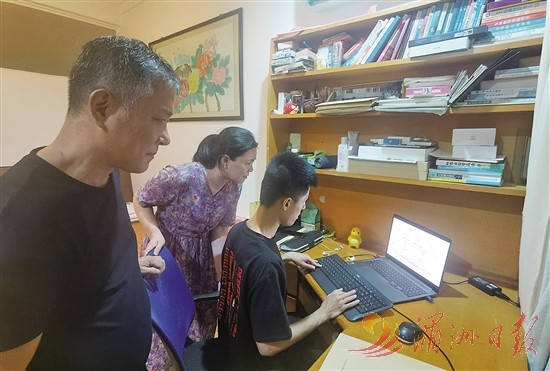 7月29日晚,黄镇宇借助屏幕阅读器,熟练使用电脑,查询高考录取信息,并与父母一起探讨规划大学生活。 全媒体记者 林晓玲 摄