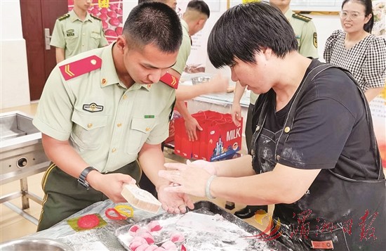 近日,荔城区委宣传部、区退役军人事务局、区双拥共建办等组织文艺宣讲队到武警莆田支队荔城中队,以“文艺+宣讲”、民俗文化体验等形式,为武警战士献上一道“文化大餐”,增进军民鱼水一家亲情谊。图为红团制作现场。 张毅 摄