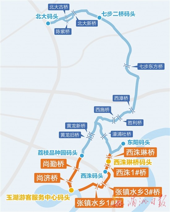 荔城区水利局工管股股长林灿乐展开图纸向记者介绍,“水上巴士”2条新航线分别为“四口嘴—荔枝品种园码头—玉湖航线”和“东阳村—西洙码头—玉湖航线”,沿途涉及6座桥梁改造,2座码头、1处游客服务中心建设。