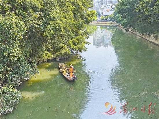 我市以河长制为抓手,加大河道日常保洁清洁力度。图为近日,荔城区护城河朝芸桥下,保洁人员在清理河道。