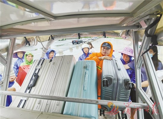 9月4日, 湄洲湾职业技术学院党员干部和志愿者们守护在校门口,冒雨为学生搬运行李箱、接送学生直达宿舍等,为学生安心返校温暖护航。 吴伟锋 摄
