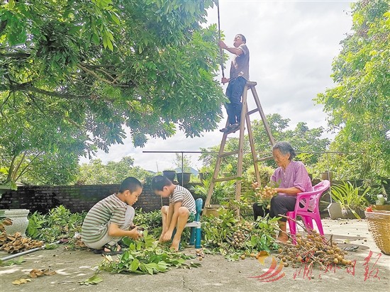 9月3日,台风“海葵”登陆前,城厢区华亭镇西湖村村民陈国辉家门口,一家人正在抢收龙眼。 陈丽君 摄