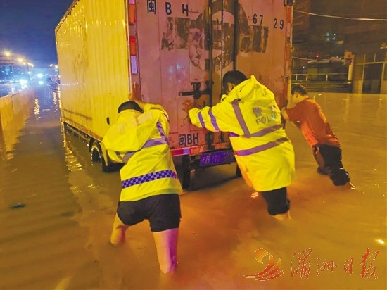 ▲受台风暴雨影响,城厢区部分路段出现积水。图为城厢交警蹚水将受困车辆推至安全地带。 翁晞晖 摄