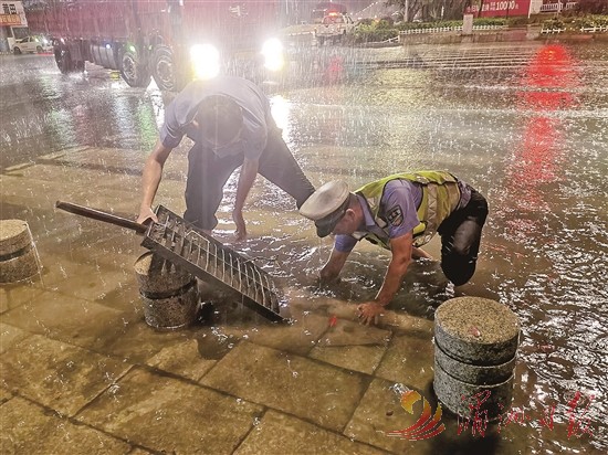 受台风“海葵”影响,我市出现强降雨天气。我市交警部门持续加强路面巡查,及时清理倾倒的树木、路障等,消除路面安全隐患,保障群众出行安全。图为涵江交警冒雨清理排水口。