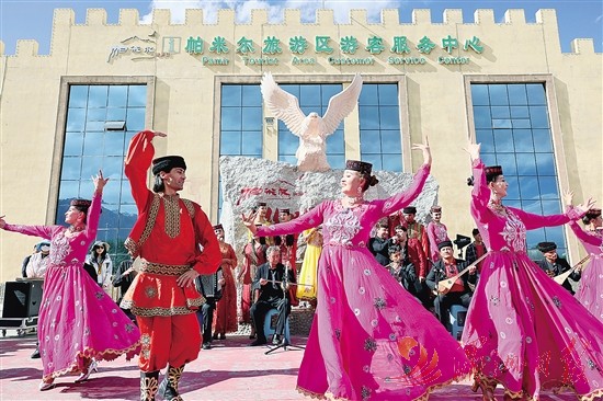 在新疆塔什库尔干塔吉克自治县帕米尔旅游区游客服务中心,县文工团演员跳舞欢迎游客。新疆塔什库尔干塔吉克自治县旅游资源丰富,集壮美高原风光、厚重历史人文和浓郁民俗风情于一体。今年1至8月,塔什库尔干塔吉克自治县接待游客超90万人次,旅游发展活力涌动。新华社记者 兰红光 摄
