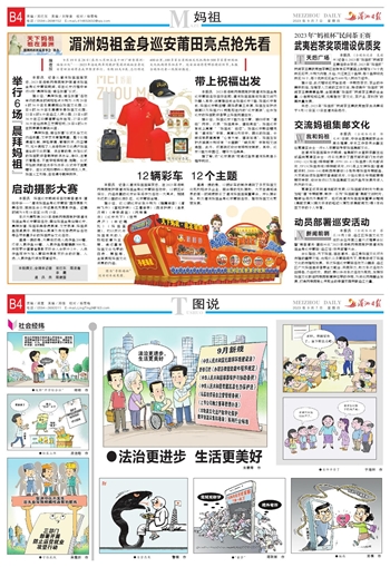 9月19日至28日(农历八月初五至十四)“瓣香湄洲·福佑兴化”——2023年海峡两岸同胞护驾湄洲妈祖金身巡安莆田活动将在我市隆重举行。为期10天9夜、总行程近400公里,100多家台湾妈祖文化机构和500多家莆田妈祖文化机构将参加其中。巡安活动将有哪些精彩环节,本报全媒体记者一线探访报道。