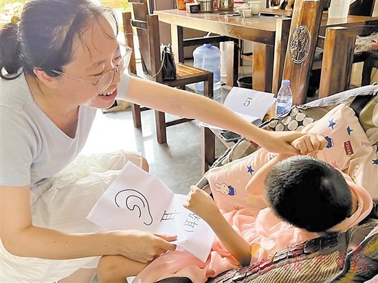 小陈今年9岁,因脑瘫行动不便,只能躺在床上,不能像其他孩子一样坐在教室里上课。当天,王丹、陈黎明和他一起玩手指游戏,唱儿歌,教他认识形状、颜色和数字。