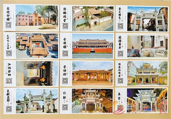《兴化府历史文化街区》邮资明信片也在此间发行。该明信片1套12枚,以《马踏飞燕》普通邮资片为载体,编号为23-350304-11-0005,展现哲理钟楼、彭鹏祠堂、壶兰雄邑牌坊、元妙观三清殿、古谯楼、福禄寿井、大宗伯第、崇公祠、陈展如故居、文献名邦牌坊、仆射牌坊和朱紫牌坊等12处人文景观(如图)。