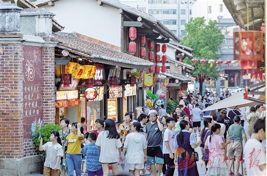 中秋国庆假期,我市推出非遗文化游、文艺展演、美食节、乡村旅游等丰富多样的文旅产品,吸引众多游客。图为游客在兴化府历史文化街区打卡、休闲、娱乐。全媒体记者 陈斌 摄