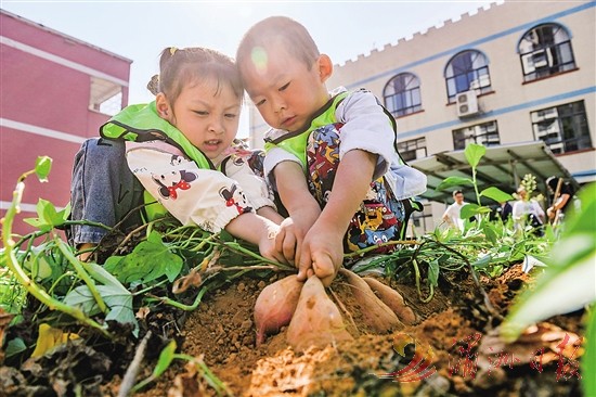 10月16日,湖南省永州市道县城东幼儿园的小朋友在体验采收红薯。当日是世界粮食日,各地幼儿园、小学、中学等开展丰富多彩的活动,让少年儿童认识粮食、体验秋收,培养孩子们爱惜和节约粮食的意识。新华社 发