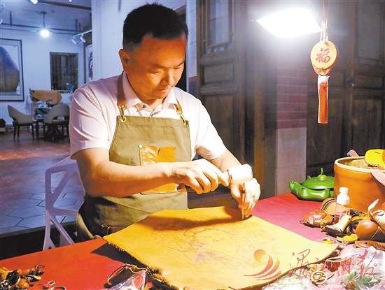 10月23日,莆田皮雕技艺第五代传承人、退役军人陈志鸿在兴化府历史文化街区非遗一条街皮雕文化体验中心制作皮雕画莆仙戏脸谱。 陈文华 摄
