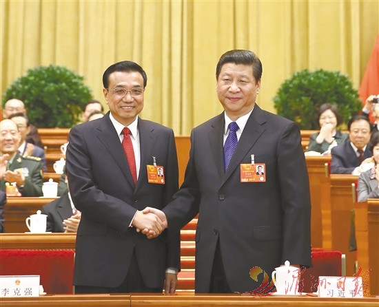 图①:2013年3月15日,第十二届全国人民代表大会第一次会议在北京人民大会堂举行第五次全体会议。会议经过投票表决,决定李克强为中华人民共和国国务院总理。这是习近平同志和李克强同志亲切握手。 新华社记者 兰红光 摄