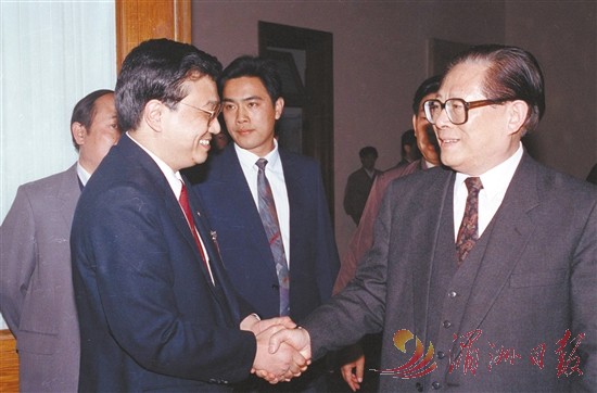 图②:1993年5月3日下午,中国共产主义青年团第十三次全国代表大会在北京人民大会堂开幕。在5月3日上午的预备会议后,举行第一次主席团会议,推选李克强等同志为主席团常务主席。这是江泽民同志与李克强同志握手。 新华社记者 郭占英 摄