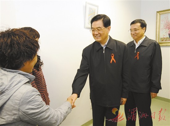 图③:2008年12月1日是第21个世界艾滋病日。胡锦涛同志和李克强同志来到北京地坛医院考察艾滋病防治工作。 新华社记者 马占成 摄