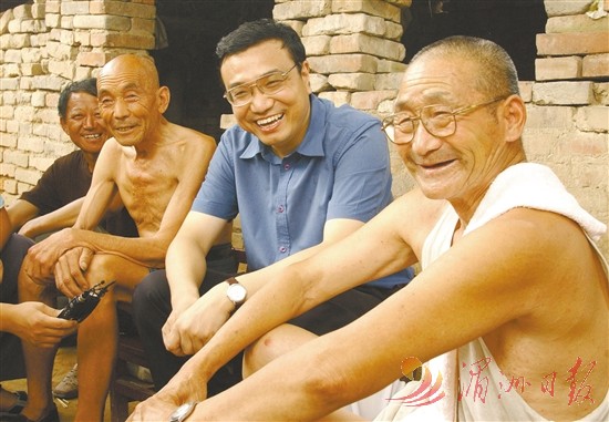 图④:2003年8月8日,李克强同志在河南省新乡市调研。这是李克强同志在原阳县桥北乡马庄村与村民亲切交谈。 新华社 发