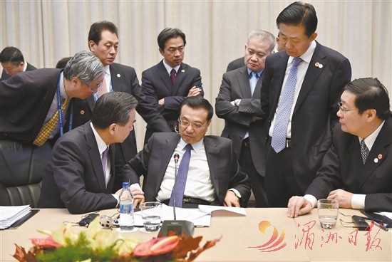 图⑨:2014年12月16日,李克强同志在贝尔格莱德出席第三次中国-中东欧国家领导人会晤。这是会谈间隙,他与随行部长进行会商。 新华社 发