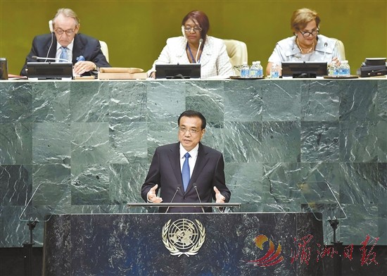 图⑪:2016年9月21日,李克强同志在纽约联合国总部出席第71届联合国大会以“可持续发展目标:共同努力改造我们的世界”为主题的一般性辩论并发表题为《携手建设和平稳定可持续发展的世界》的讲话。 新华社记者 李涛 摄