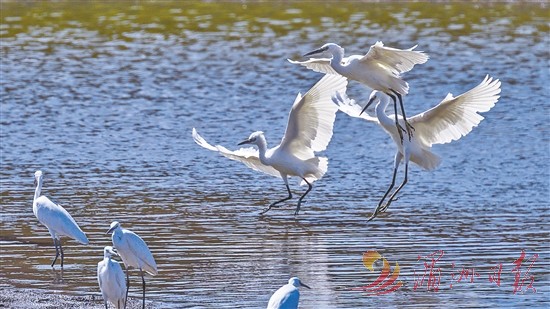 10月30日,木兰溪“蓝色海湾”涵江段附近,成群的白鹭在嬉戏捕食。 蔡昊 摄