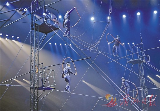 四位哥伦比亚男演员展示高空高低钢丝技艺。日前,第七届中国国际马戏节在广东珠海开幕,来自18个国家和地区的近200名中外马戏演员带着创新节目学习交流、切磋技艺,助力中外马戏交流合作。新华社 发