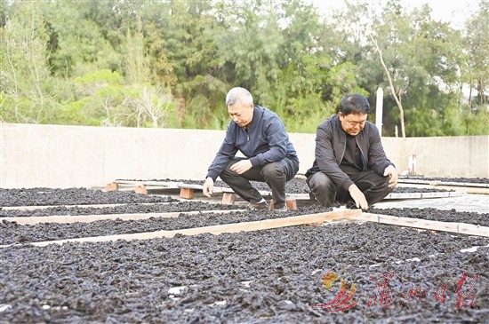 严志洪(左)下乡查看紫菜收成和晾晒情况。 全媒体记者 林罗晓 摄