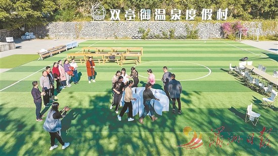 图为职工在萩芦镇的疗休养基地做游戏。 全媒体记者 陈斌 摄