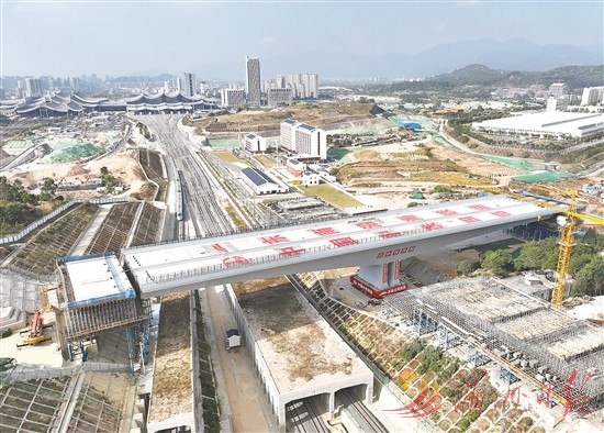 这是厦门跨东海域通道北延伸段工程上跨福厦高铁公路桥转体梁成功转体后现场。当日,厦门跨东海域通道北延伸段工程上跨福厦高铁公路桥转体梁成功转体,标志着项目建设取得突破性进展。该工程采用“先建桥后转体”的施工方式,确保福厦高铁安全运行。据介绍,该转体梁也是世界同类型工程中跨度较大、重量较重的混凝土T构转体梁。 新华社记者 林善传 摄