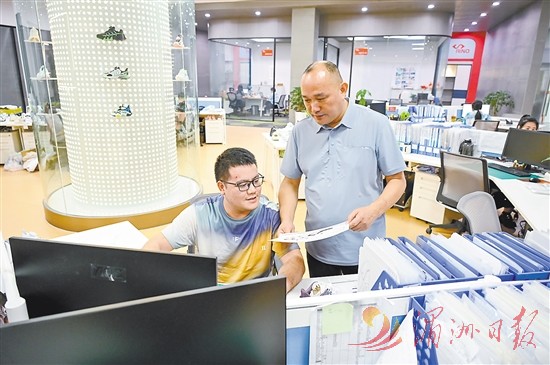 林金星(右)在查看鞋品研发设计等情况。 全媒体记者 杨怡玲 摄