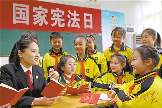 12月4日,在山东省枣庄市市中区文化路小学,法官给学生讲解宪法知识。当日是第十个国家宪法日,