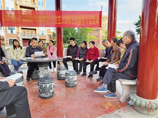 近日,黄石镇惠下村新建成的十音亭里,村党支部书记吴金贵为党员和群众作乡村振兴专题党课。现场气氛热烈,村干部踊跃发言,谈想法、讲问题、提意见。