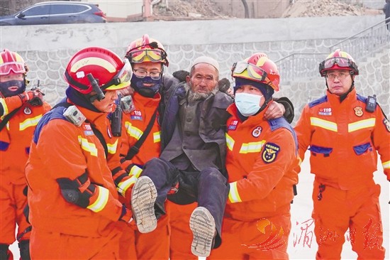 12月19日,在甘肃省临夏回族自治州积石山保安族东乡族撒拉族自治县大河家镇大河村,消防人员开展救援。当前,甘肃省正全力组织救援。 新华社记者 马希平 摄