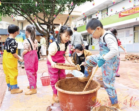 城厢区教师进修学校附属幼儿园根据儿童兴趣特点,创新开发“木工匠”“泥巴乐”“建筑家”等自主游戏,让孩子们自己设计游戏玩法、自主选择材料和同伴,自由探索、亲身体验、主动思考,从中获取经验。图为12月15日,小朋友们在自主游戏。 林心怡 许金珊 摄