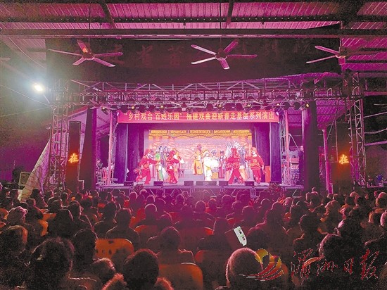 当天表演在莆仙戏传统折子戏《目连救母·穷士吟》中拉开序幕,“三折弯”“拖鞋拖”等特殊表演科介配以三下颠、雀步、摇步、馁步等动作,生动地表现出主人公落魄潦倒、愤世嫉俗又假作斯文的精神状态。《吕蒙正·大且喜》演绎吕蒙正高中状元后派人接其妻刘月娥进京的情境,结尾独特的“抬轿子”演绎出情趣横生的喜剧效果。《单刀赴会》则借助莆仙戏红面武生的扇法,塑造了独特的莆仙戏关羽形象。《海神妈祖·梳发立志》表演掀起高潮,妈祖林默乐善好施、扶危济困、慈悲为怀的高尚品德博得在场观众声声喝彩。当晚,在黄石镇余埭村也上演了戏曲节目《三姓奇缘》,营造欢乐吉祥、温暖和顺的节日氛围(如图)。