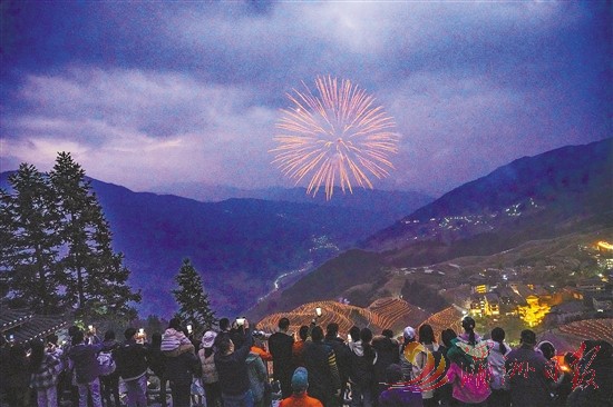 2023年12月31日傍晚,在广西桂林市龙胜各族自治县龙脊镇平安村,游客在观赏梯田烟花美景。文化和旅游部1日发布2024年元旦假期文化和旅游市场情况。经文化和旅游部数据中心测算,元旦假期3天,全国国内旅游出游1.35亿人次,同比增长155.3%,按可比口径较2019年同期增长9.4%;实现国内旅游收入797.3亿元,同比增长200.7%,较2019年同期增长5.6%。假期全国文化和旅游市场平稳有序。新华社 发
