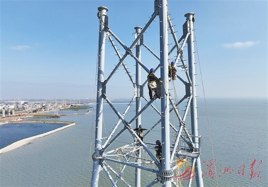 1月2日,电力施工人员在福建福清兴化湾海上架空线路工程组塔作业现场施工。新年伊始,各行各业的劳动者忙碌在各自的岗位上,接续奋斗,干劲十足。新华社 发